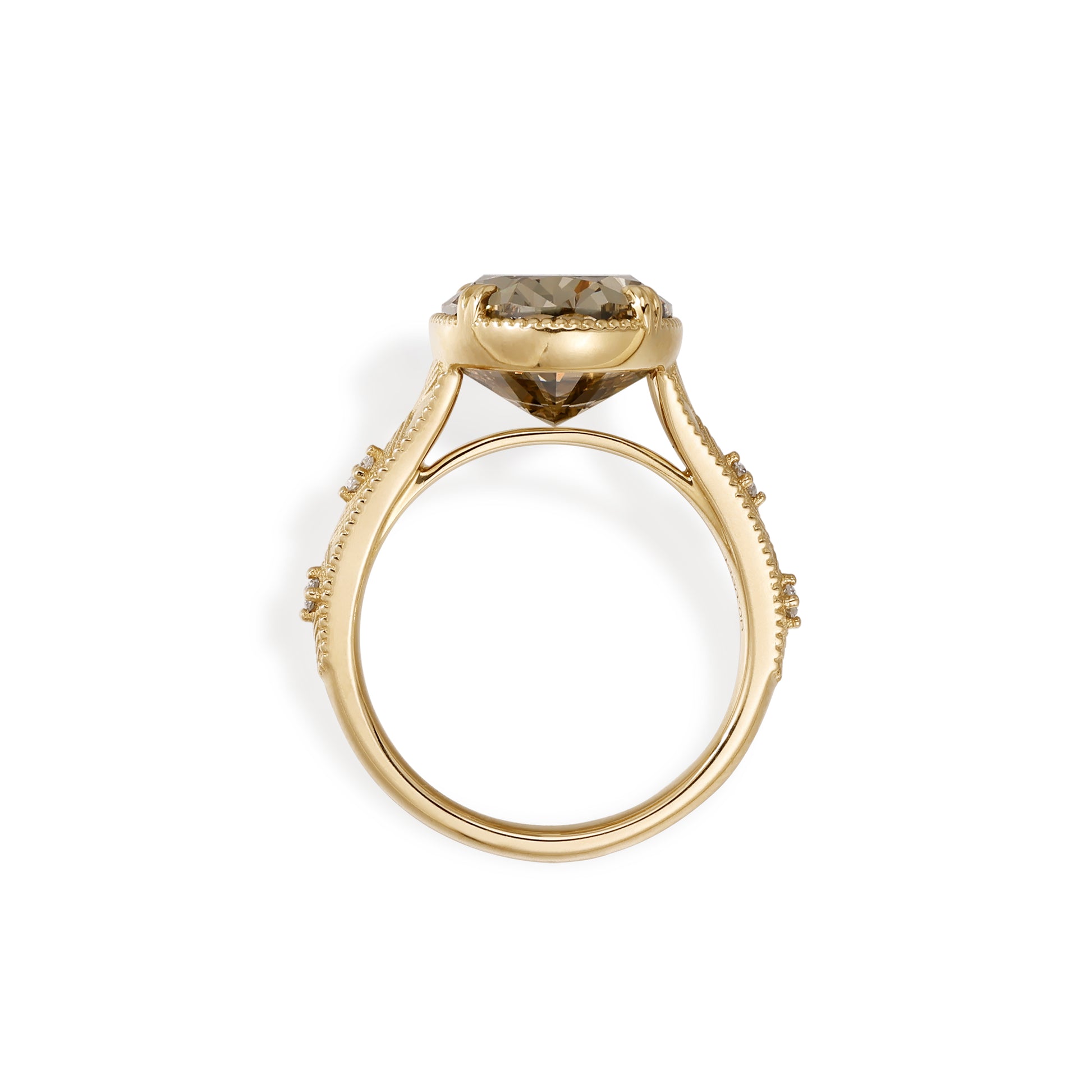 Bathed in the warm glow of golden light, this unique engagement ring captures the essence of vintage romance and modern sophistication. At its heart lies a 7.42-carat fancy brown oval lab grown diamond, radiating a rich, even champagne hue that flows seamlessly across its surface—free from the typical bow-tie shadow. The result is a mesmerizing play of light and depth, making it a truly unique lab grown diamond engagement ring unlike any other.