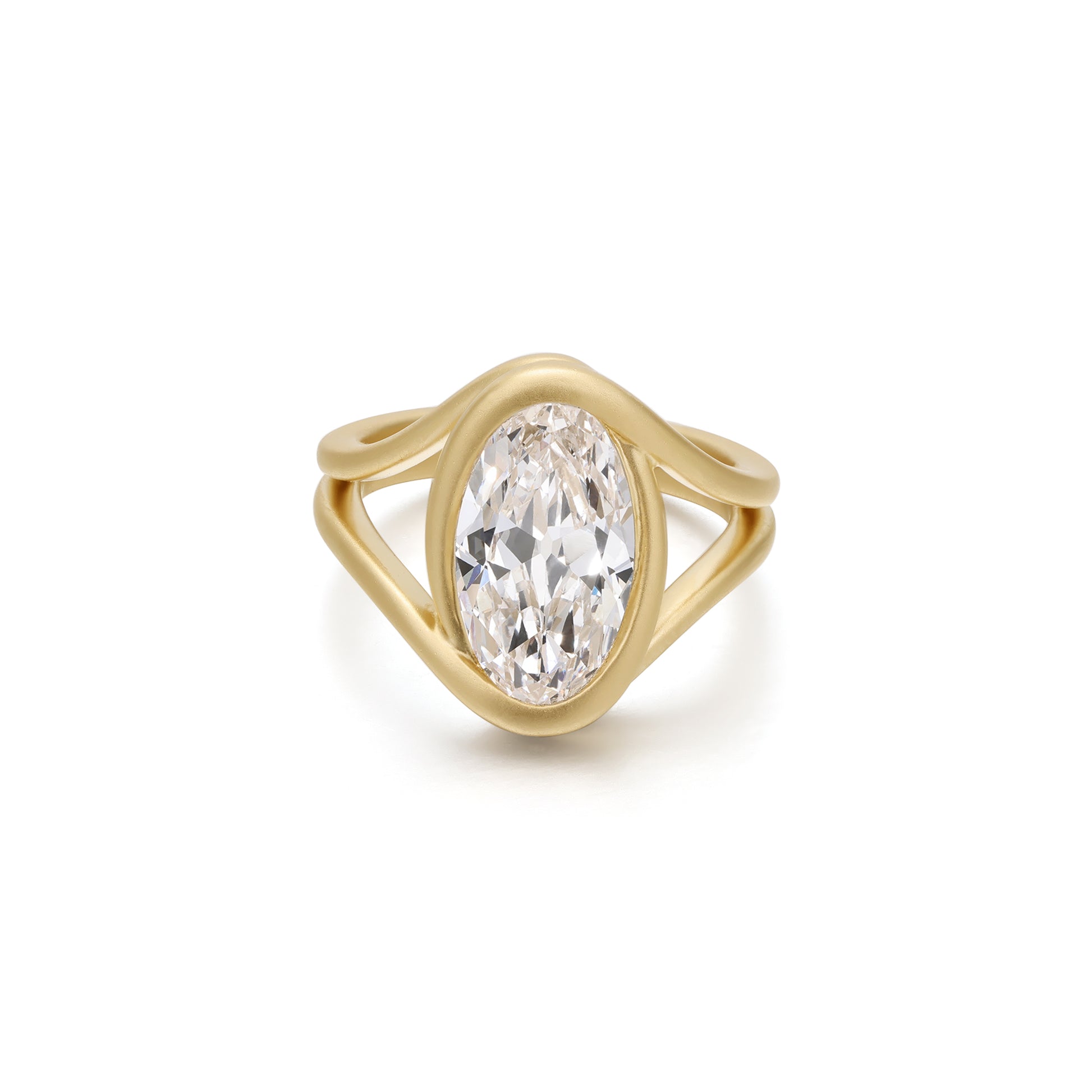 This one-of-a-kind ring features a 3.48ct Antique Moval Cut Diamond set in brushed 14K Yellow Gold. The elongated vintage silhouette gives the ring a soft, glowing presence, creating a refined statement for anyone seeking a unique diamond engagement ring.