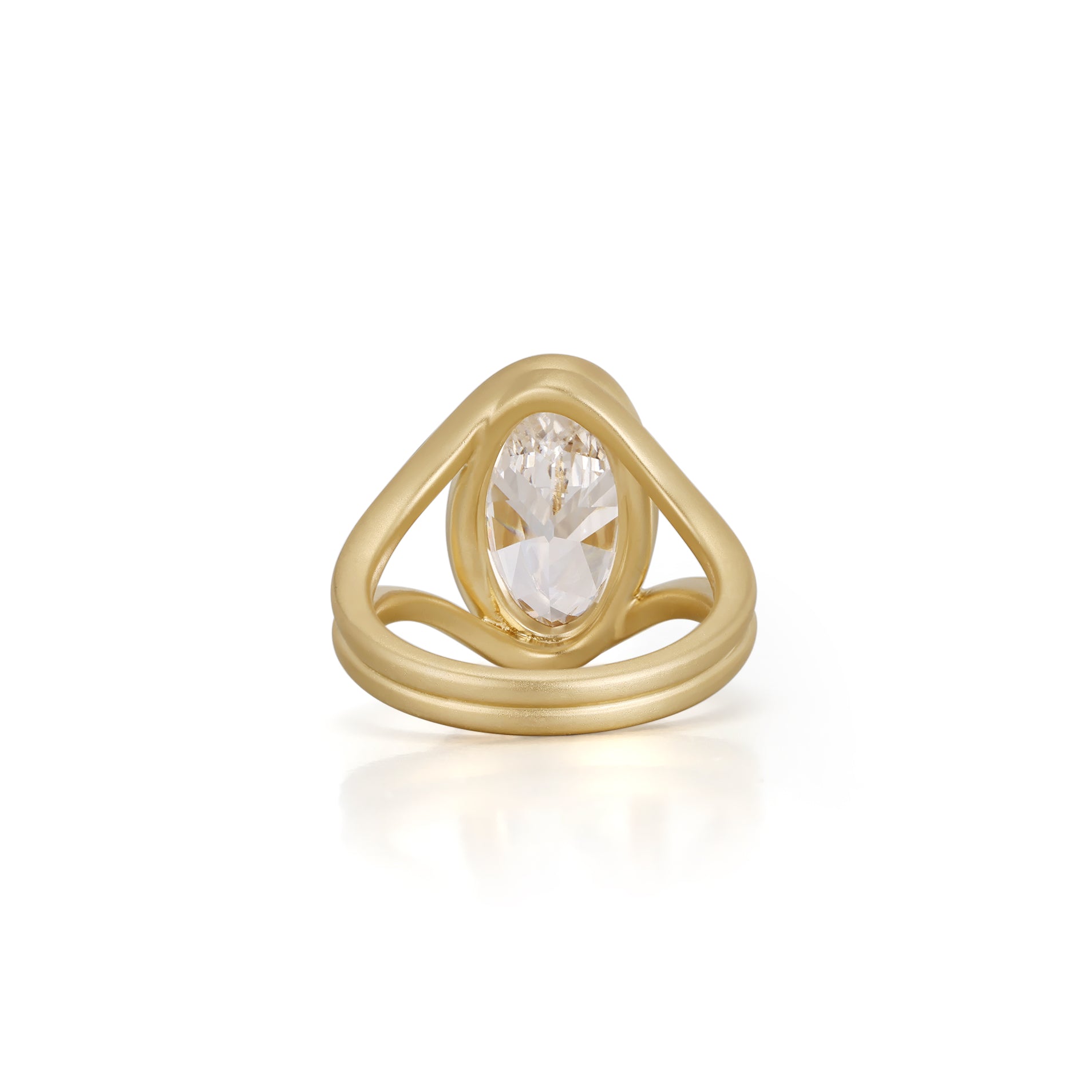 The sculptural bezel wraps the stone in smooth gold lines and holds it securely without prongs. The brushed finish adds a modern, elegant texture and enhances the warm tone of the metal. The open, airy structure keeps the design light while letting the antique cut diamond take full focus. This piece is part of the Celeste series and is designed for collectors who love distinctive fine jewelry.