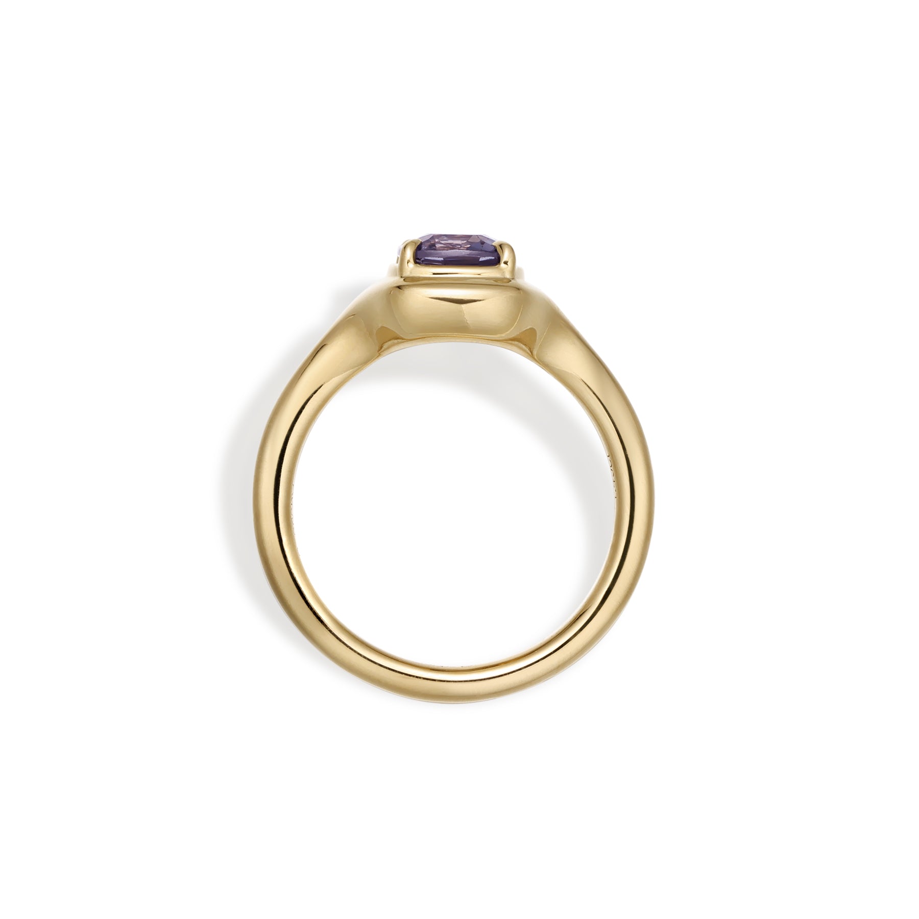 This ring features a 1.35ct natural purple spinel set in polished 14K yellow gold. The soft violet tone feels elegant and calm, and the cushion cut gives the stone a refined sparkle from every angle. The smooth gold frame adds a gentle, vintage touch while keeping the look clean and modern.