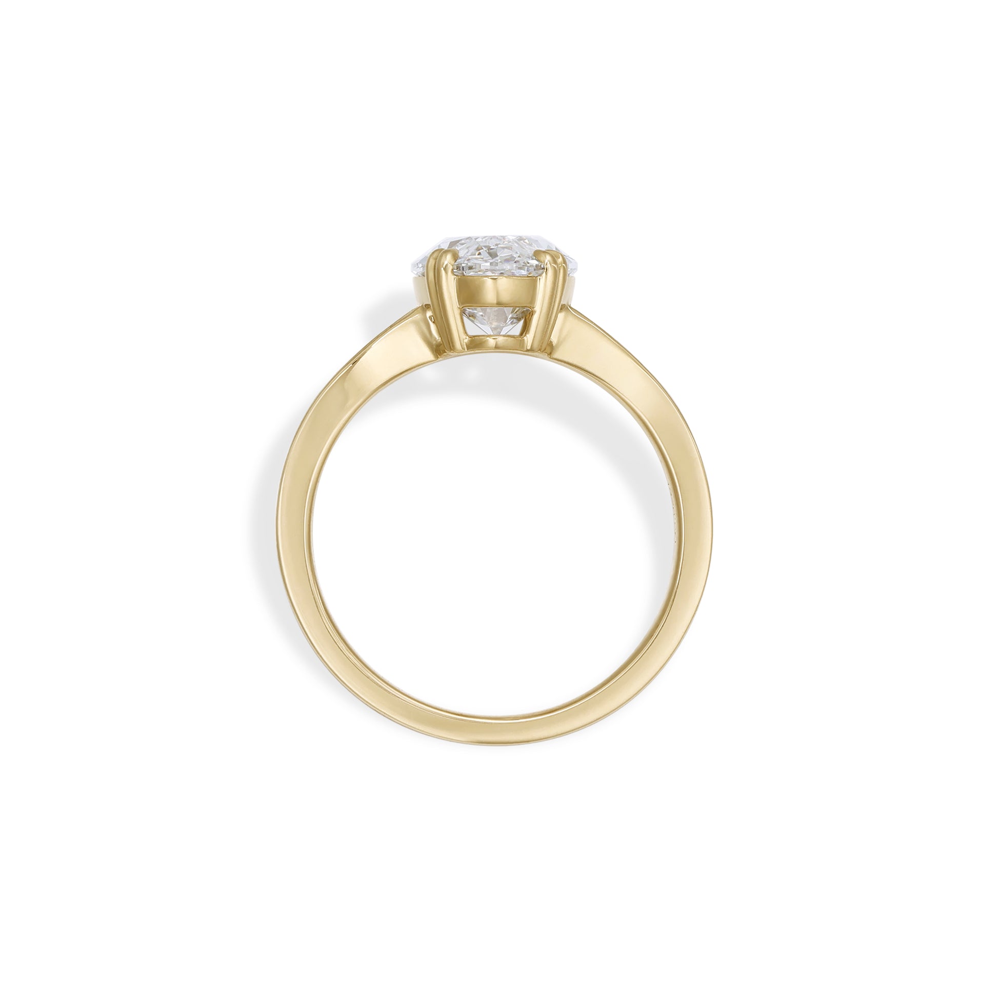 The Esther ring features a distinctive moval Old Mine cut diamond, combining an elongated silhouette with vintage character. The minimalist four-prong setting highlights the diamond’s natural brilliance, allowing the fire of the antique cut to take center stage.