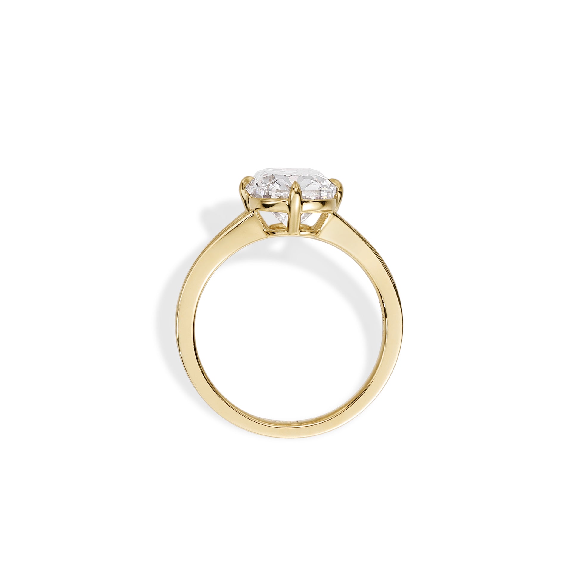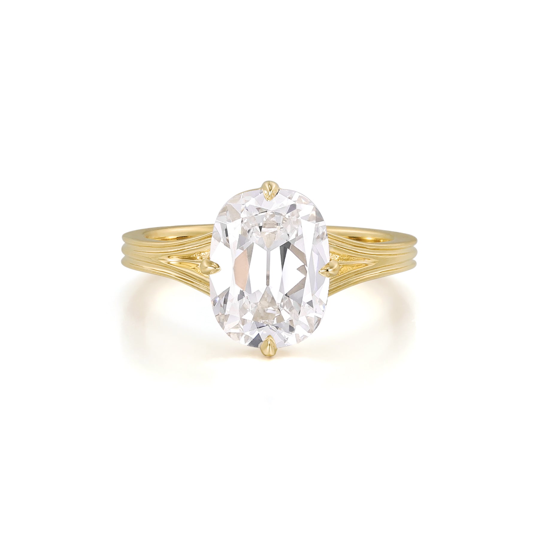 Set in a classic four-prong setting, the diamond is held with minimal structure to allow maximum light performance. The split shank band with subtle fluted detailing adds texture and depth, creating a soft architectural effect that complements the antique character of the stone. Available in 2ct to 4ct and crafted in 14K or 18K gold, this design offers a balanced expression of vintage inspiration and modern elegance.