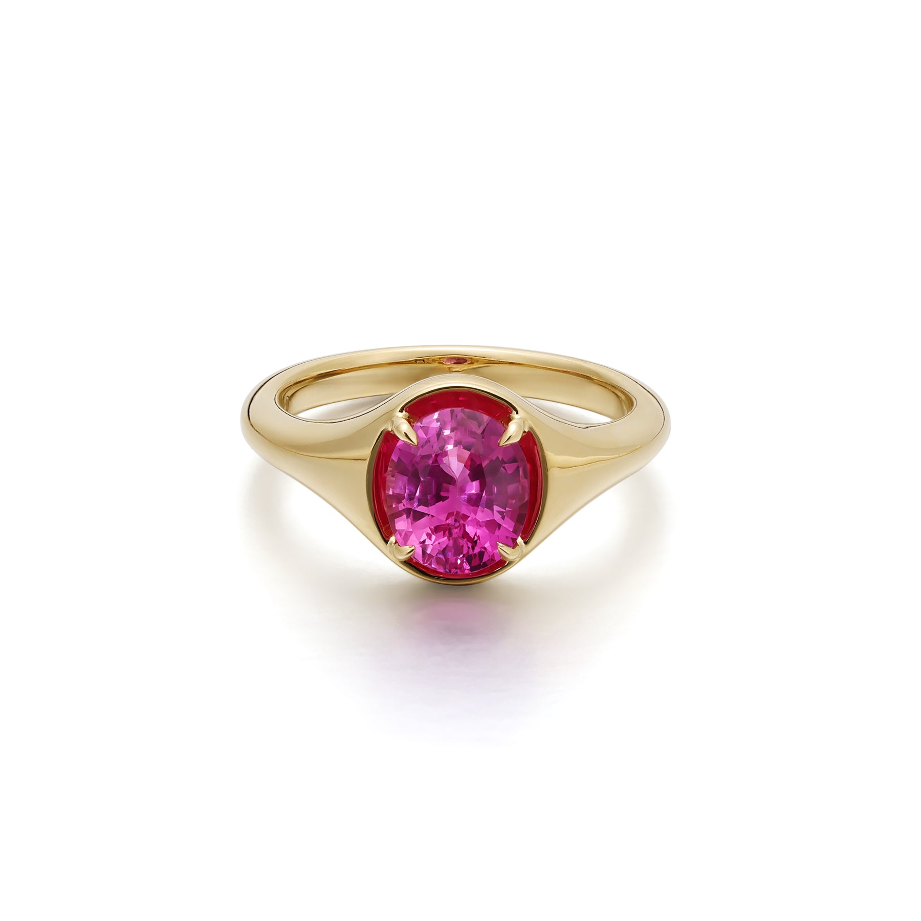 This ring features a vibrant 1.90ct lab-grown hot pink sapphire set in polished 14K yellow gold. The color is bold and bright, giving a strong pop of saturated pink that stands out instantly. Its oval cut brings soft sparkle and a refined look.