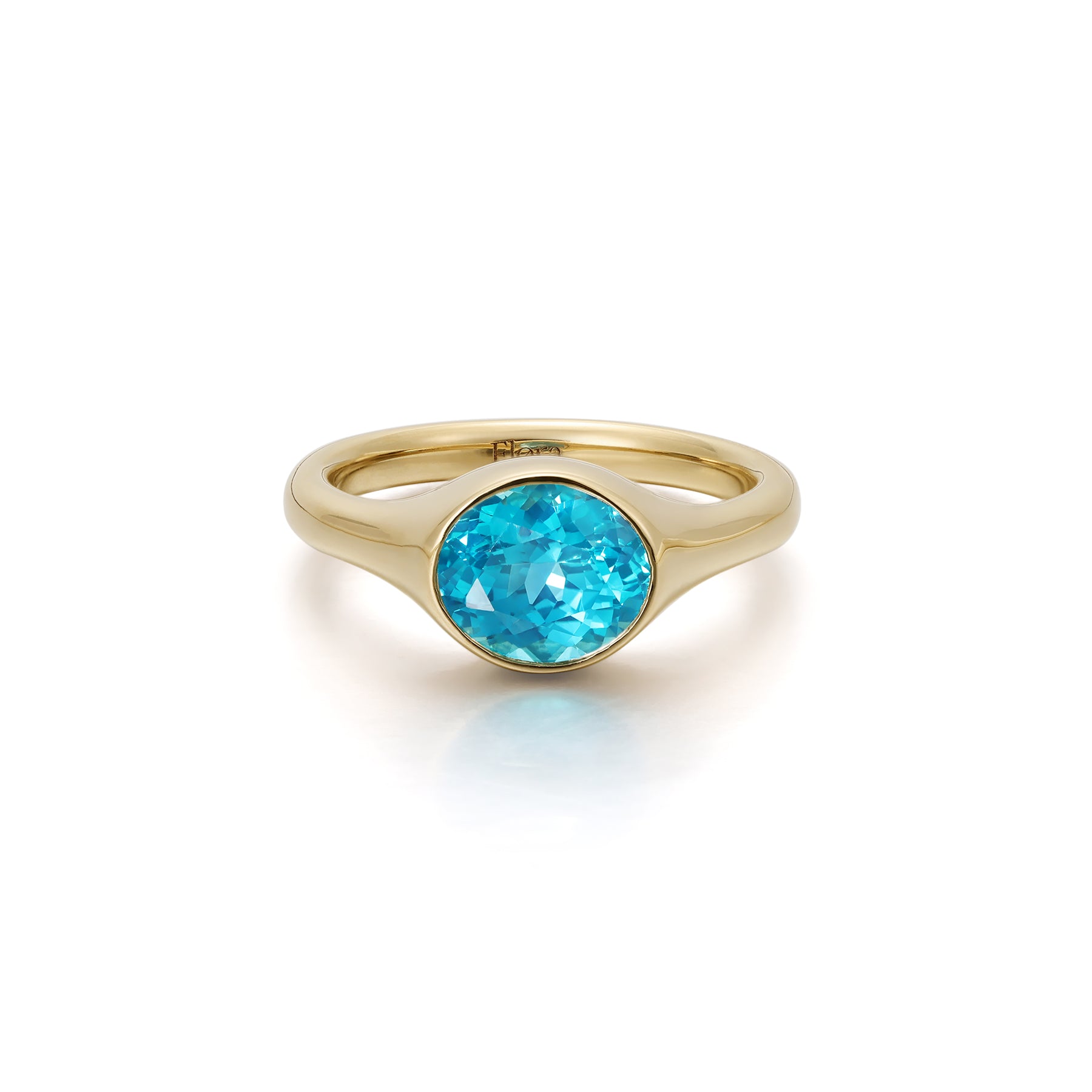 This ring features a 2.40ct Lab-Grown Paraiba Tourmaline set in solid 14K Yellow Gold. The gemstone shows a vivid neon blue color that is bright, clear, and instantly eye-catching. The smooth bezel frame creates a modern look while keeping the stone secure and glowing from every angle.
