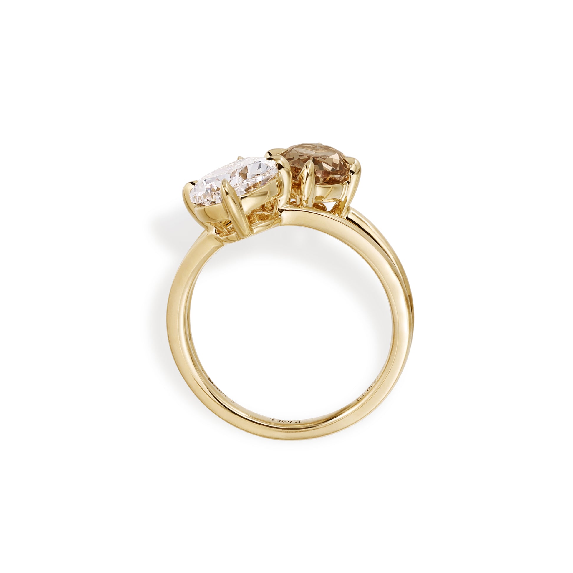 A celebration of contrast and connection, this Toi et Moi ring pairs two extraordinary cuts in harmonious balance - a 2.3 carat antique-cut pear diamond and a 1.6 carat fancy intense brownish orange oval diamond. The luminous white and fiery amber tones reflect the duality of passion and serenity, intertwined on a graceful 14K or 18K yellow gold band. With its bold symmetry and romantic symbolism, this piece captures the essence of two souls meeting — distinct yet inseparable.