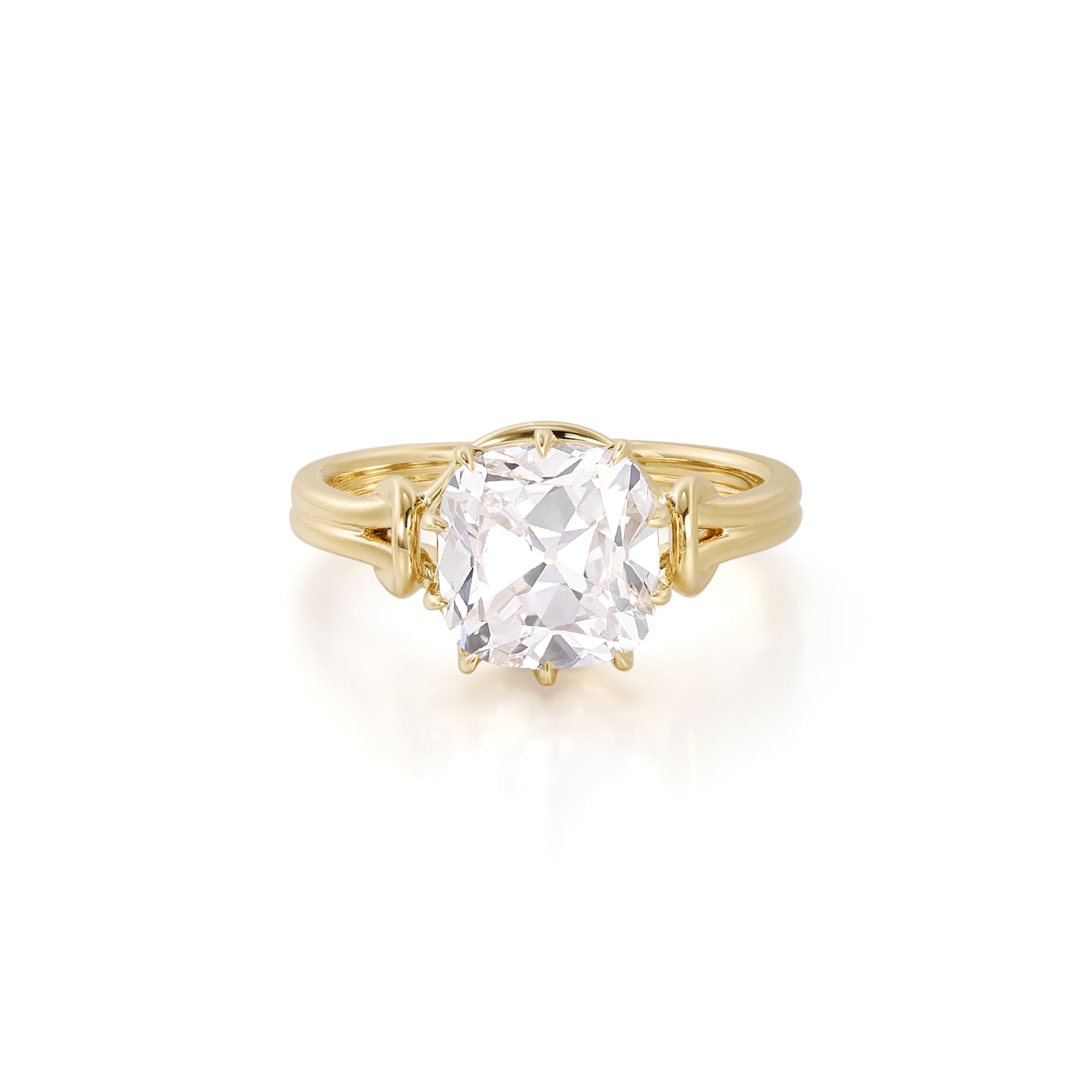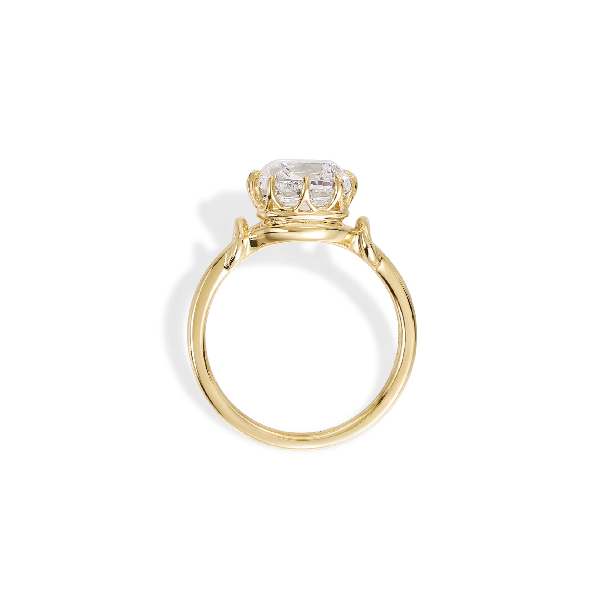 Set in a refined multi-prong setting, the diamond is elevated within an open gallery that allows light to enter freely from all angles. The sculpted shoulders and subtle split detailing add movement and structure to the band, creating a fluid yet architectural silhouette. Available in 2ct to 4ct and crafted in 14K or 18K gold, this design offers flexibility while maintaining its refined, vintage-inspired character.